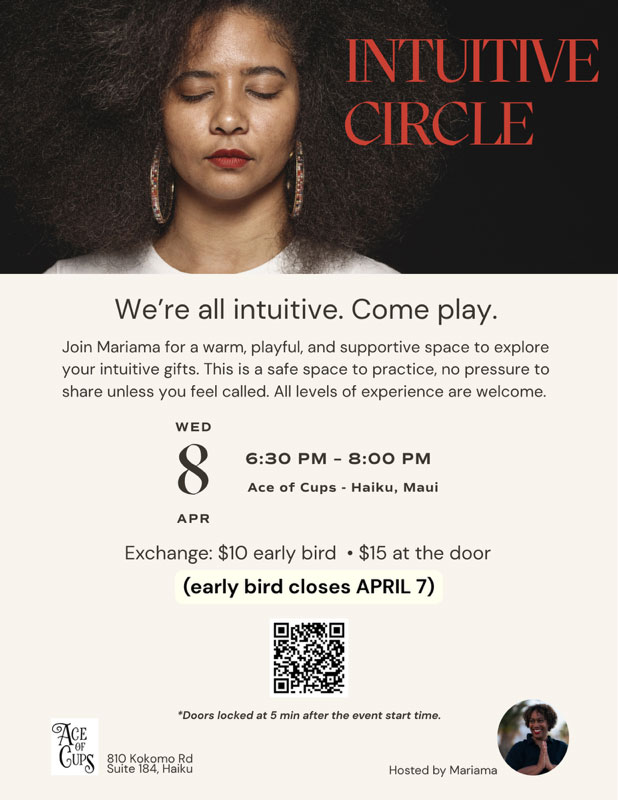 Join Mariama for a warm, playful, and supportive space to explore your intuitive gifts. This is a safe space to practice, no pressure to share unless you feel called. All levels of experience are welcome.