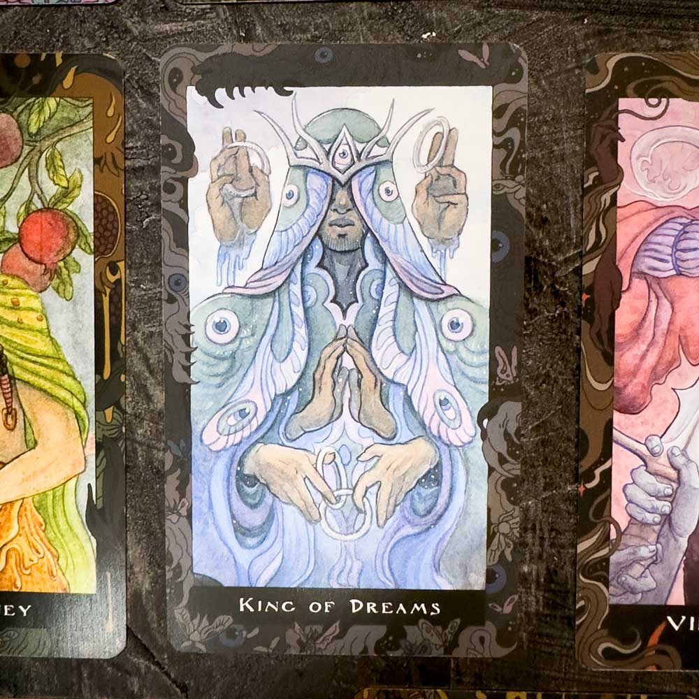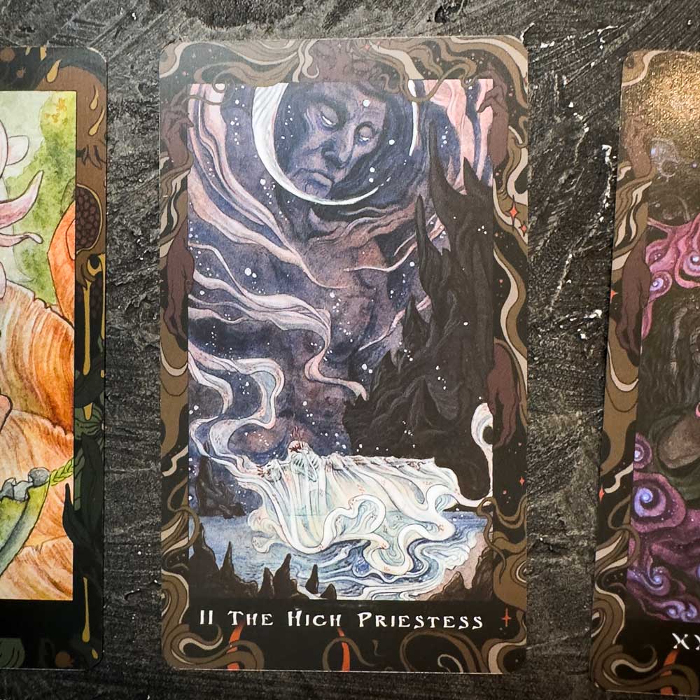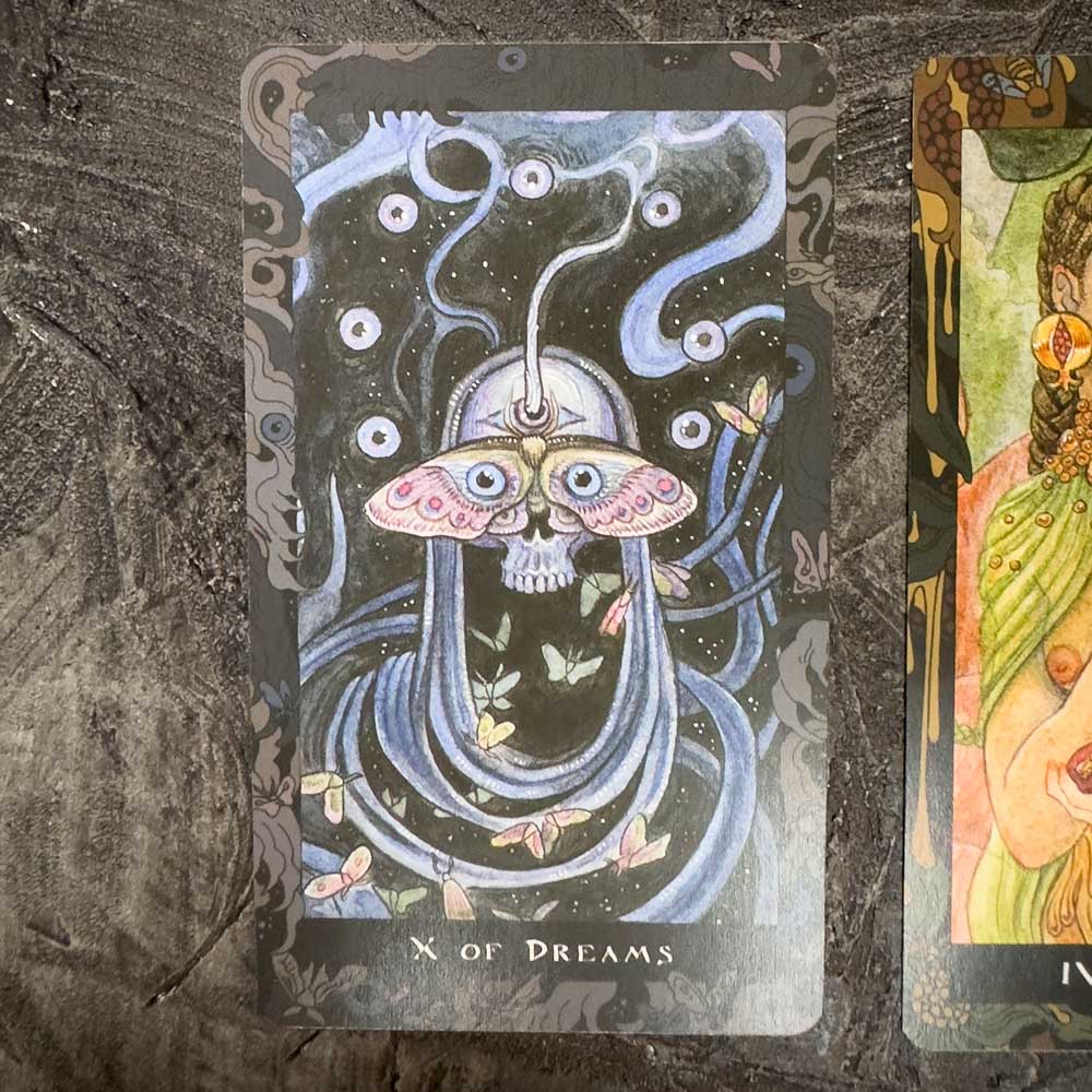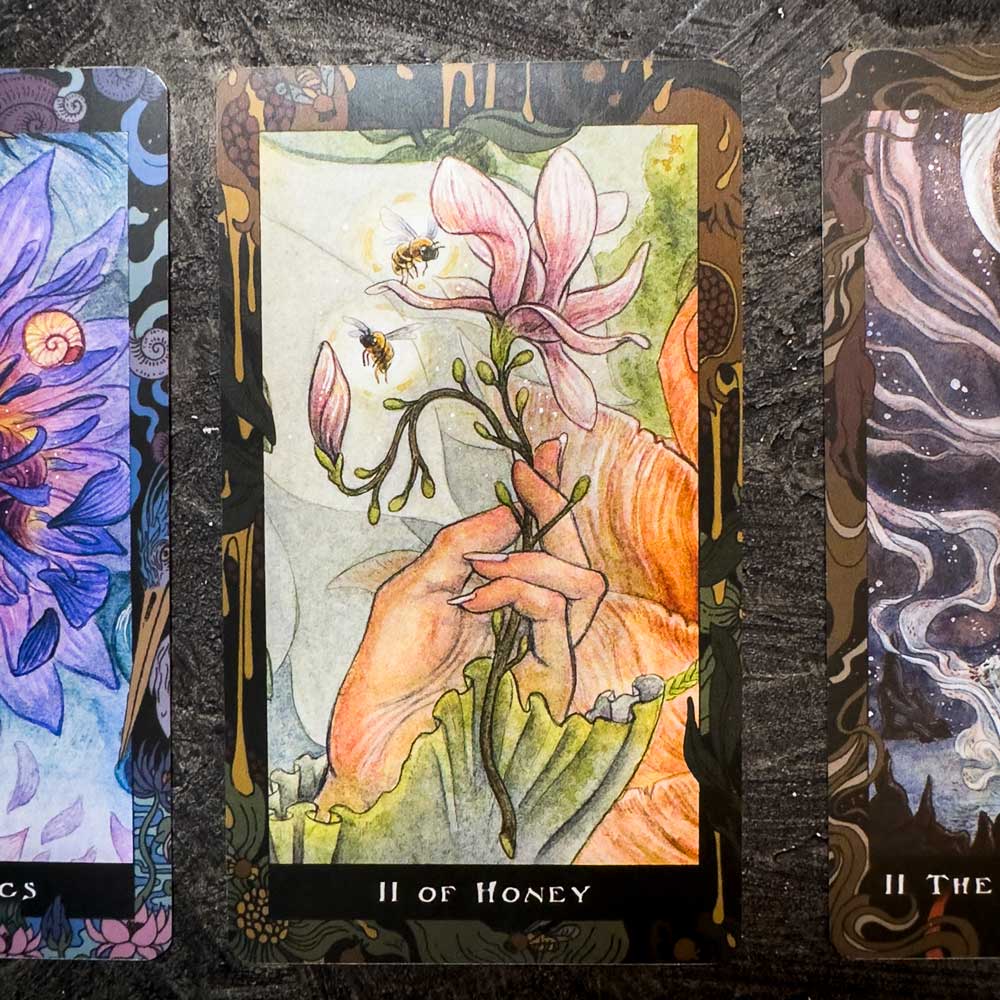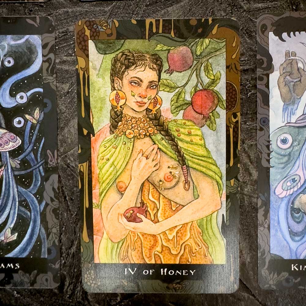 "A Gorgeously Vivid Dream of Tarot… The Blood Moon Tarot is a fully illustrated, 78-card tarot deck. Each image is lush with details from my personal mythologies. The Minor Arcana is expressed through the unique suits Dreams, Songs, Skins, and Honey while the Major Arcana presents as a series of enchanting, dream-like visions. Use this deck to sit with your struggles, learn how to navigate the emotional landscapes within yourself, and connect with the mystery of the world around you."