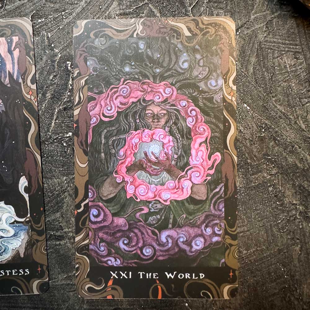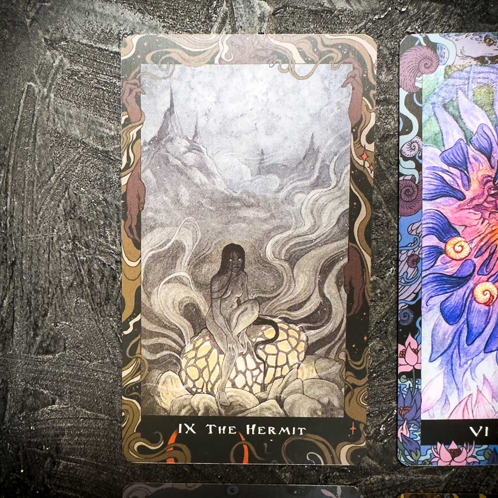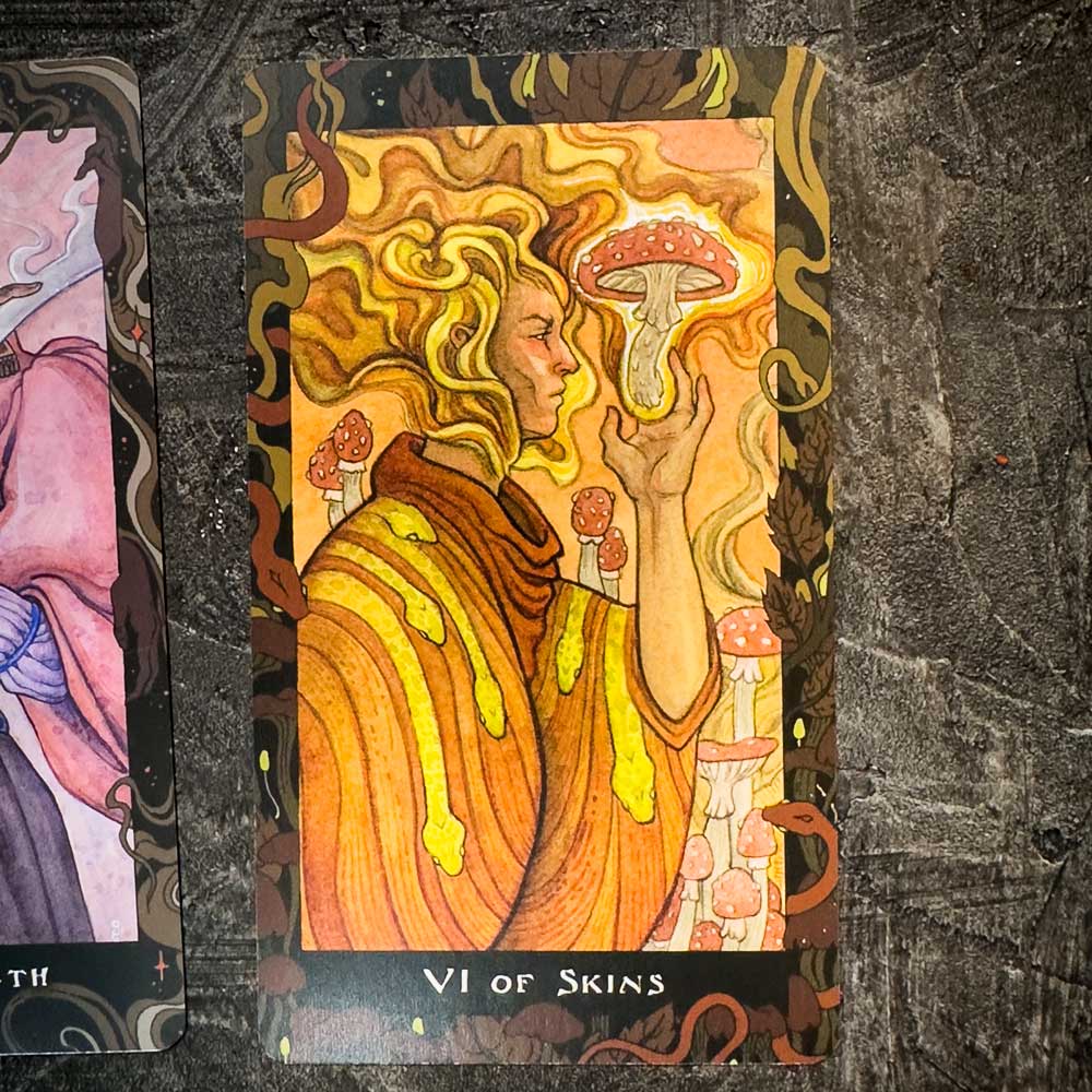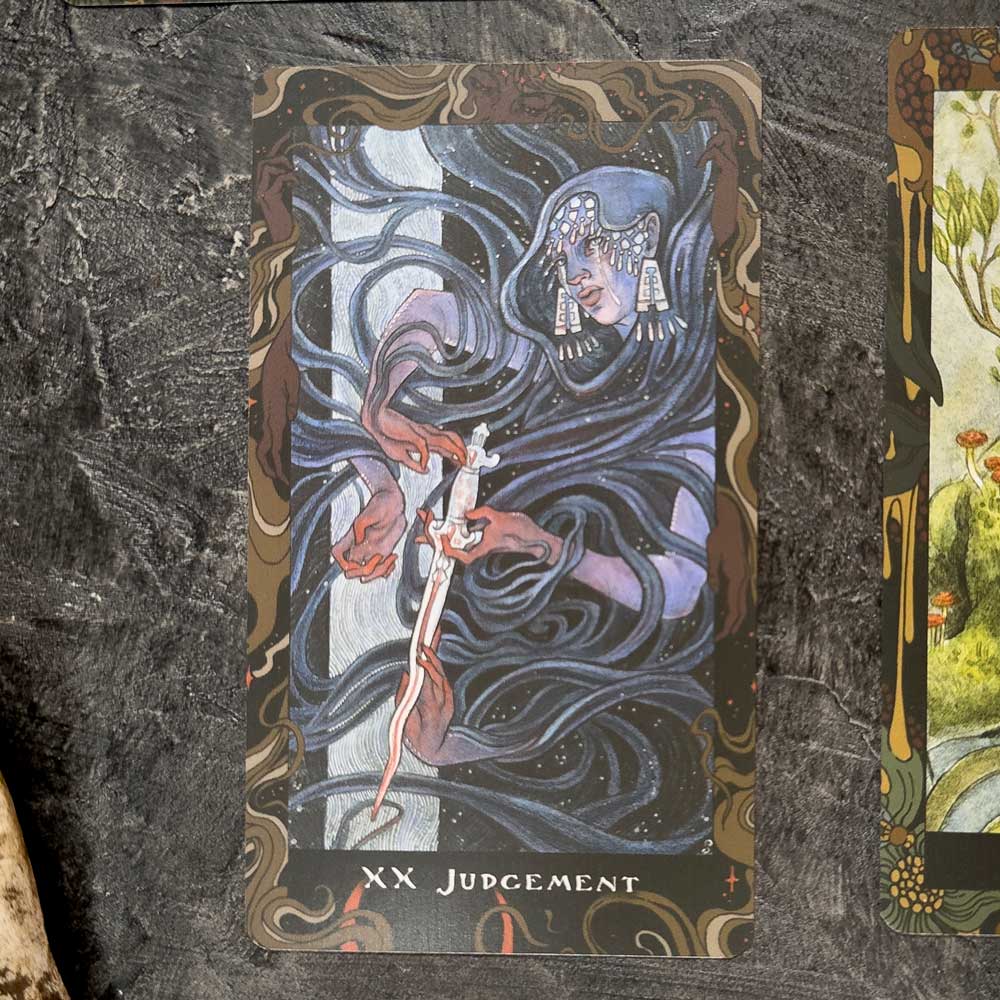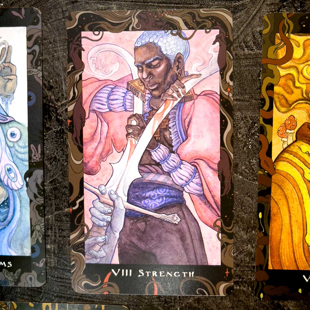 "A Gorgeously Vivid Dream of Tarot… The Blood Moon Tarot is a fully illustrated, 78-card tarot deck. Each image is lush with details from my personal mythologies. The Minor Arcana is expressed through the unique suits Dreams, Songs, Skins, and Honey while the Major Arcana presents as a series of enchanting, dream-like visions. Use this deck to sit with your struggles, learn how to navigate the emotional landscapes within yourself, and connect with the mystery of the world around you."
